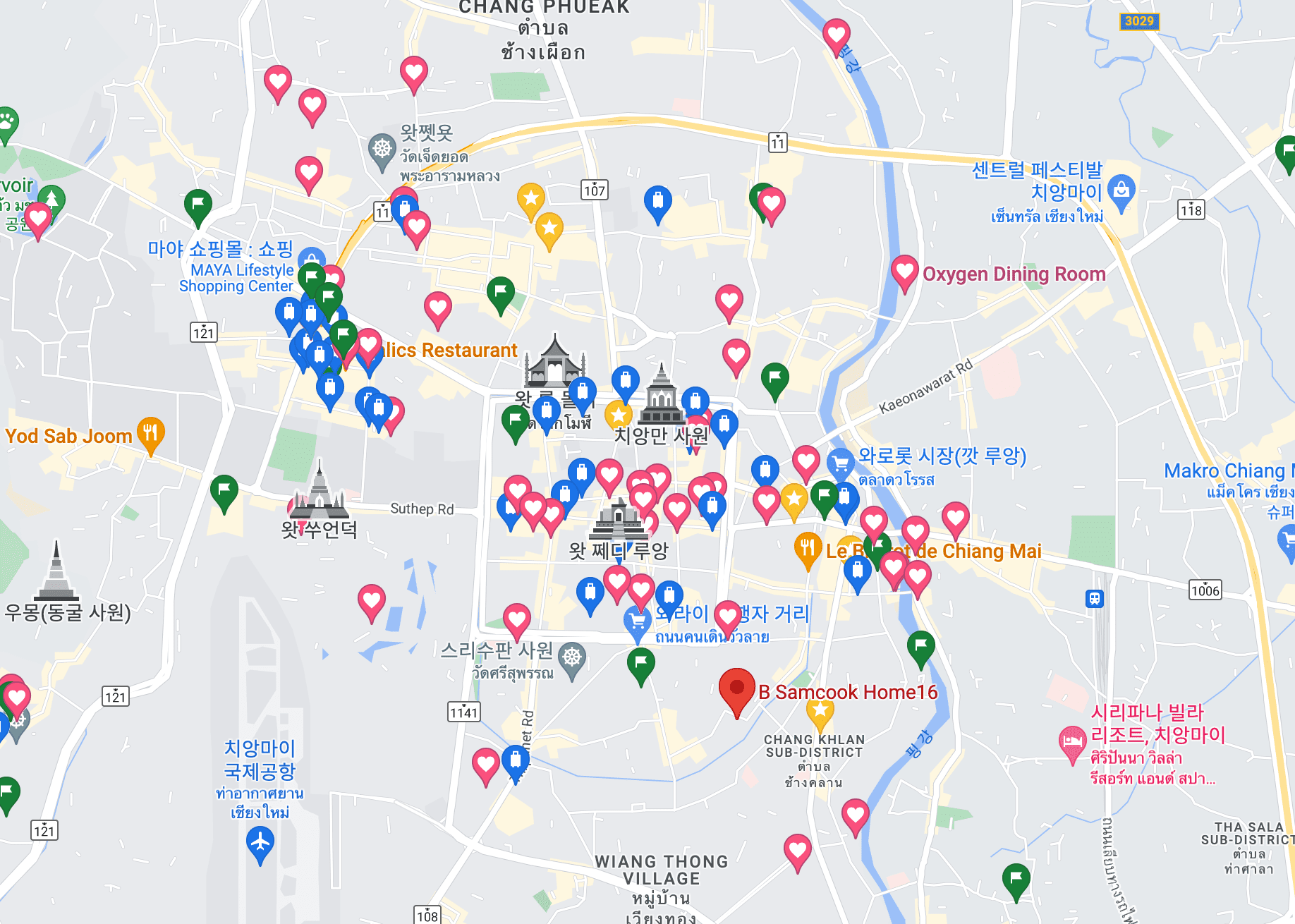 반면 님만해민은 치앙마이의 신시가지로, 많은 분들이 서울의 가로수길과 같은 곳이라고 비유를 합니다. 저는 님만해민에서 반절, 올드타운에서 반절의 시간을 계획했으나 결국 거의 올드타운에서 지냈으며, 저녁과 아침시간까지 활동하는 것을 좋아했기 때문에 결론적으로는 올드타운에 숙소를 잡기를 잘했다고 생각합니다. 님만해민은 위 지도에서 '마야 쇼핑몰'이라고 되어 있는 곳 부근을 의미하는데, 더 최근에 지어진 숙소들이나 감성숙소들이 많습니다. 저는 가로수길 느낌은 서울 가로수길에서 느끼자는 주의로 현지 분위기가 더 나는 올드타운을 선택했습니다. 추가로, 싼티탐이 조금 저렴해서 이쪽으로 숙소 잡으시는 분들도 많은데, 길거리에 돌아다니는 깡패 개들이 많다고 하여 저는 무서워서 싼티탐은 애초에 제외하였습니다. 여행에서 만난 동행 중 한명은 싼티탐에서 묵었는데 싼티탐만의 분위기가 또 매력있다고 합니다.